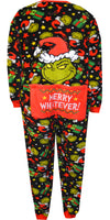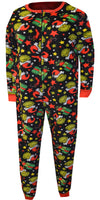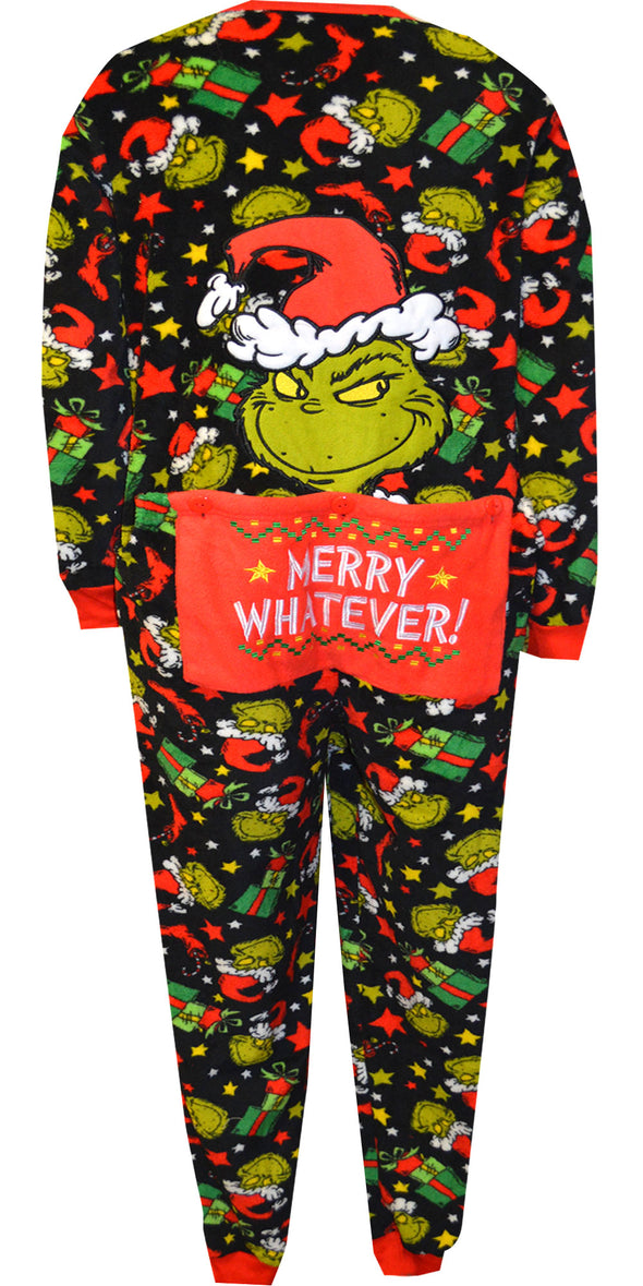Time to feel Grinchy! This union suit style pajama for women features the much loved Grinch Who Stole Christmas on a black micro plush background with Christmas presents and stockings. There is even a drop seat that says 'Merry Whatever'. Machine washable and easy care. Missy cut.