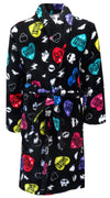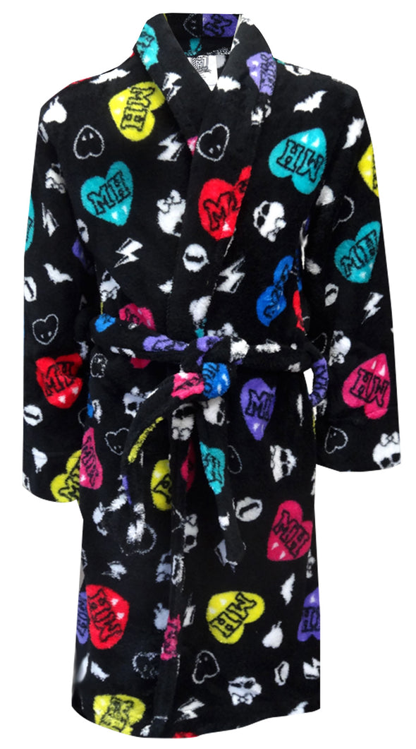These robes are so warm and cozy! These Monster High robes have an all-over print of the Monster High logos and hearts on a black background. This plush robe has an anchored belt on the exterior so it doesn't get lost. It is sure to be a hit with any Monster High fan. Small size is a Girls' 6/6X.