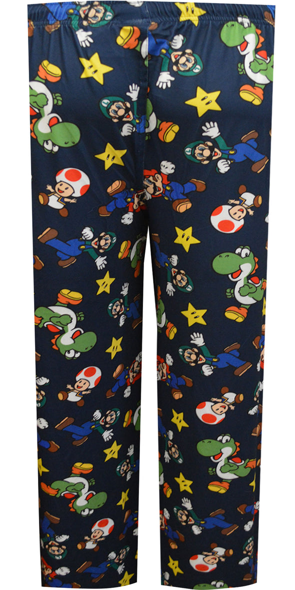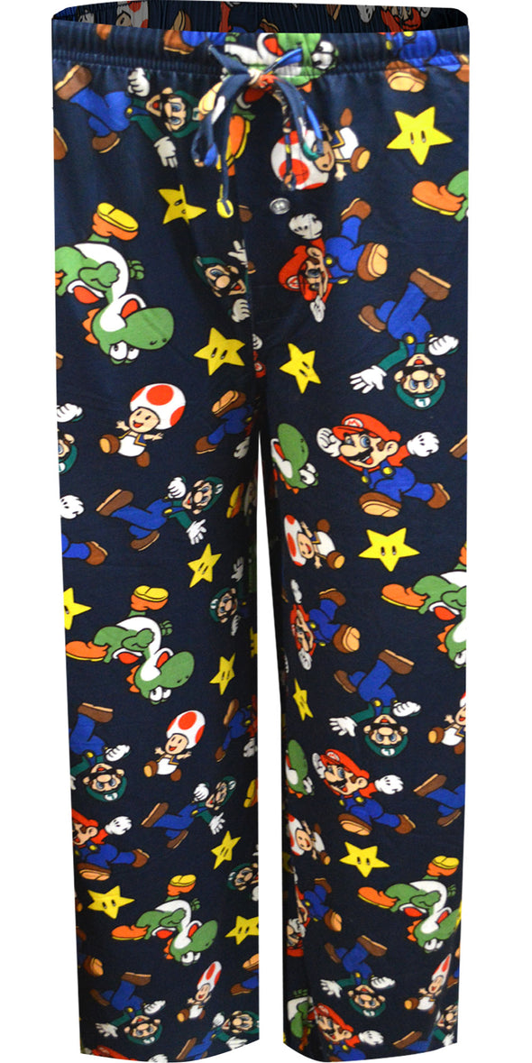 Get ready to jump and play! These colorful performance fabric lounge pants for men feature Nintendo's much loved Super Mario Brothers characters Mario, Luigi, Toad, Yoshi and the powerups on a navy blue background. Machine washable with a button fly and drawstring tie, covered elastic waistband with side pockets. This performance fabric is super soft.